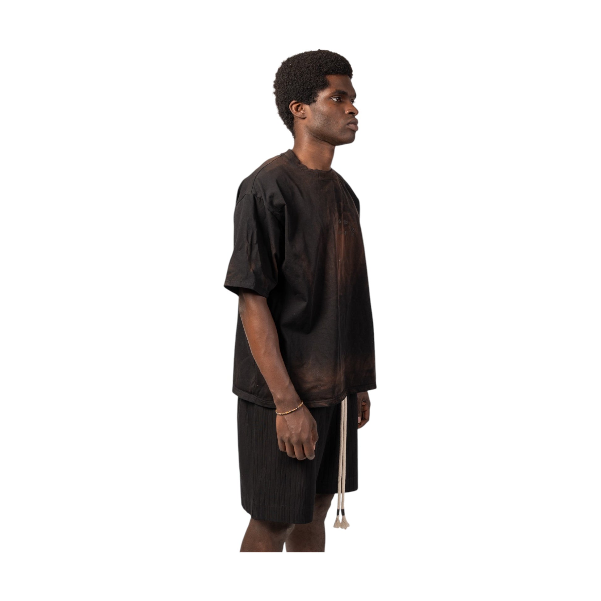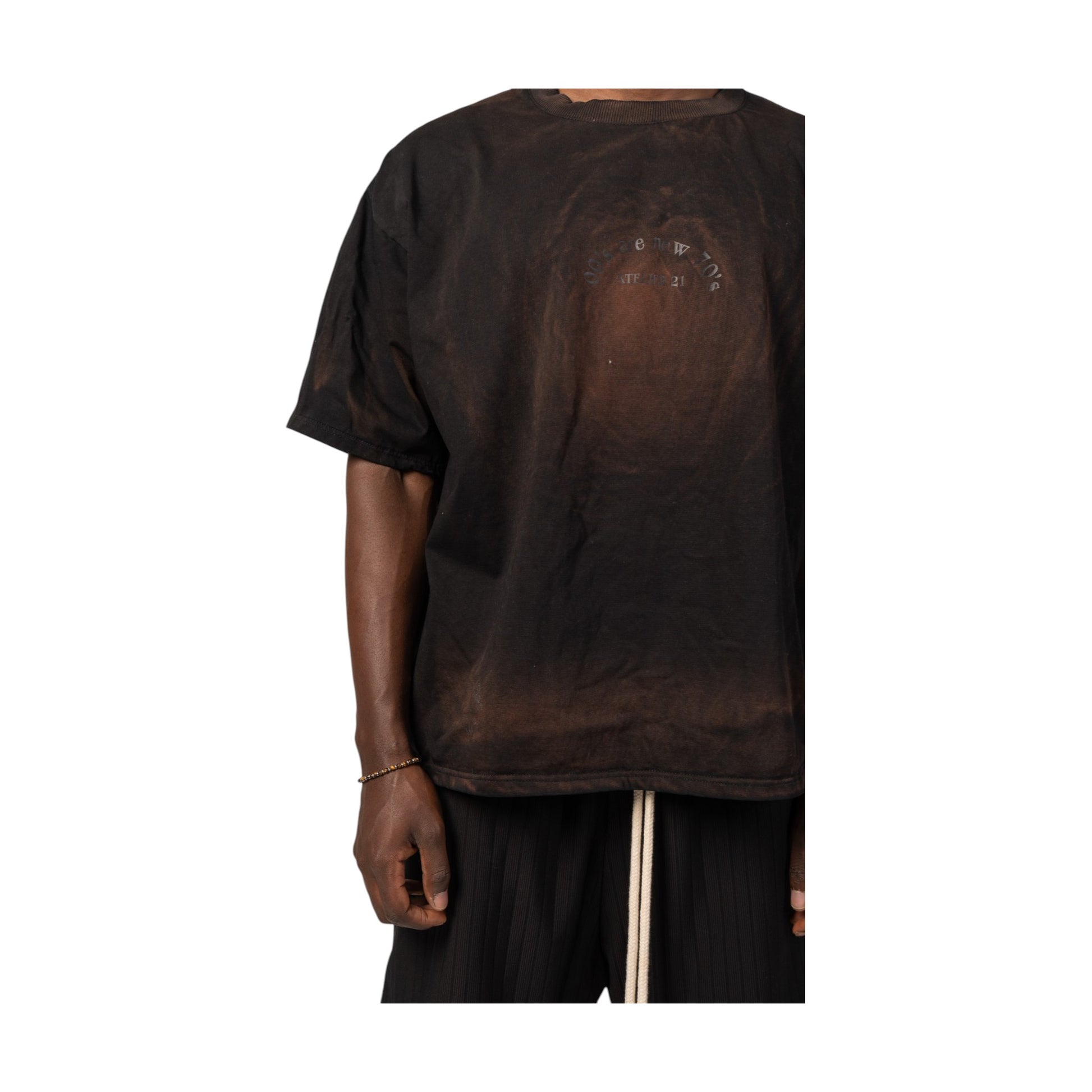 Black tee with brown washes and print black on black on the center, each shirt has a difference from the others.